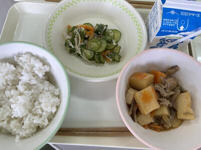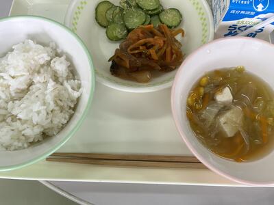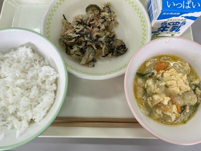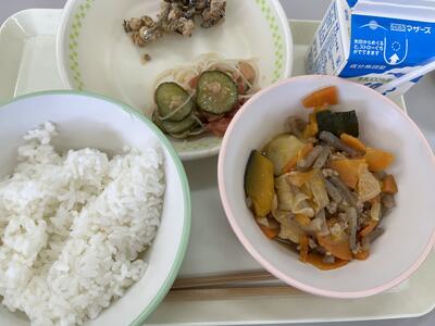 今日は、いわしの梅煮でした。甘辛い醤油だれと一緒に梅干しを入れて煮てありました。濃い味付けでごはんにぴったりでしたよ。高圧力で調理され、骨までやわらかく、残すところなく食べることができ、カルシウムもたっぷりとれました。いつもおいしい給食をありがとうございます。