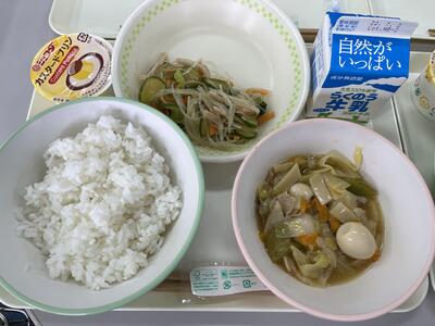 今日は、八宝菜でした。八宝菜は中華料理のひとつで、豚肉やいろいろな野菜を炒めたものです。八宝菜の八はどういう意味だと思いますか?この八はたくさんという意味があって、いろいろな食品をとりあわせてつくる意味だそうです。今日の八宝菜は何種類の食品が入っているか数えながらいただきました。