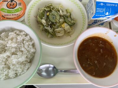 今日は、ハヤシライスでした。ごはんの上にかけていただきました。ハヤシライスは明治時代に日本でうまれた料理(洋食)だそうです。そのもとになった料理がハッシュドビーフだそうです。ハッシュドビーフは、イギリスの料理で、ハッシュは肉を細かく切る、ビーフは牛肉という意味があります。このハッシュドビーフにとろみをつけ、ごはんにかけたのがハヤシライスです。