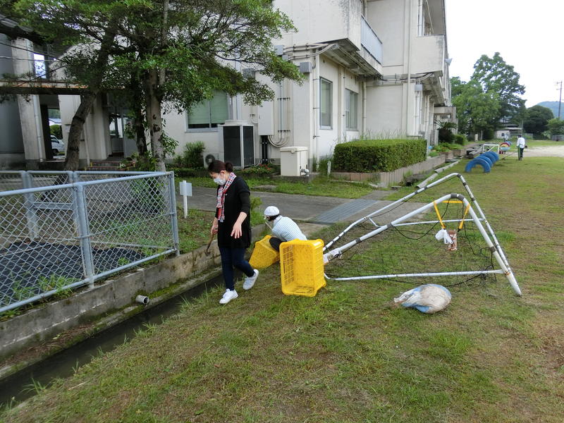 6日から昨日にかけての大雨により、不安と恐怖を感じられながら過ごされたことと思います。被害に遭われました方には心よりお見舞い申し上げます。校区の至る所で土砂崩れや道路の冠水、家屋への浸水、流木による被害、通行止め等、大変な状況となりました。学校でも、子供たちを下校させた後の3時頃には、学校前の水田や道路から溢れた水が、運動場へ川のように流れ込みました。運動場の用水路のところに設置してあった丸太(電柱材)が外れ、池のようになった運動場の中を流れて行き、ブランコの所まで移動したほどです。水の力を目の当たりにしたところです。中庭も水で溢れました。画像は、ブランコの所まで流された丸太(電柱材)です(撮影は本日)。今日は、晴れているとはいえ、土砂は多くの水を含んでいますし、川も増水しています。十分に注意するよう指導を徹底したいと思います。