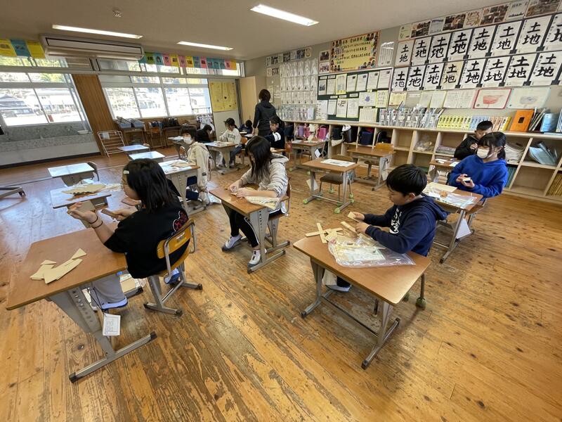 今日、4年生は熊本県立美術館より4名の学芸員さんをお招きし、細川家2代目当主細川忠興の甲冑レプリカを鑑賞しながら、甲冑の仕組みについて学びました。