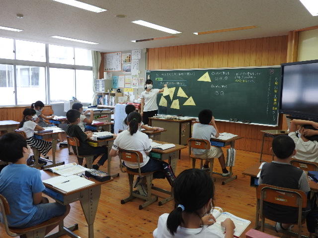 昨日の5時間目に、南関町学力向上研究協議会が本校で開催されました。参加者は、教育長はじめ町教育委員会関係者、各学校の研究主任、学校教育専門指導員、ICT機器支援員、本校職員(授業をしている職員以外)です。町では、Society5.0(超スマート社会)で生きる子供たちのために、ICT機器、特にタブレットを使った授業を推進しています。3年生の授業を参観し、その後パソコン室で協議をしました。画像は、授業の様子です。