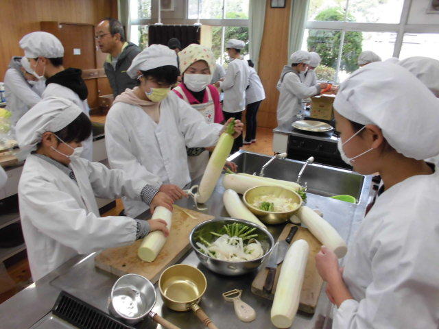 明日のふれあい祭りに向けて準備が始まりました。画像は6年生が、地域婦人会の皆様のご指導を受けながら、豚汁500人分の材料(人参・大根・里芋・白菜・ごぼう)を準備をしている様子です。
