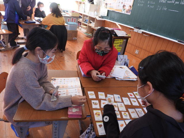 店に行って買い物をする場面を想定しての活動です。一人はお客さん役、一人は接待をする店員さん役、一人はレジを担当する店員さん役になって、英語で会話をする活動です。