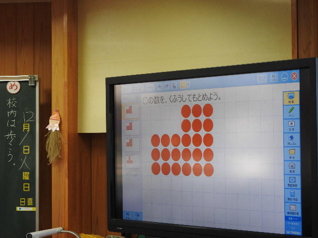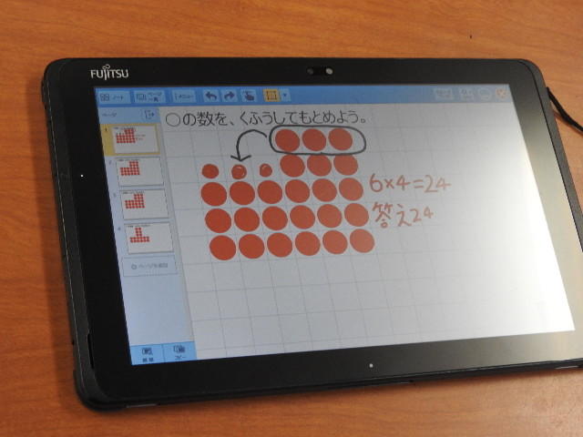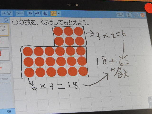 赤丸の数を数えるのではなく、かけ算を使って式を立て、赤丸の数を求めます。タブレットに求め方の工夫をかき込んでいます。