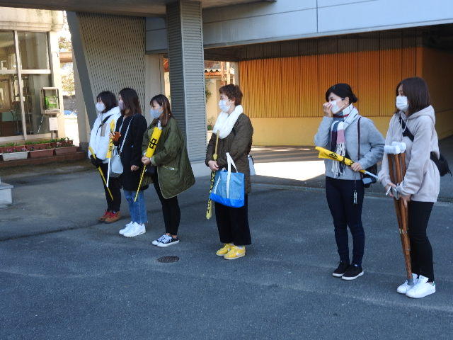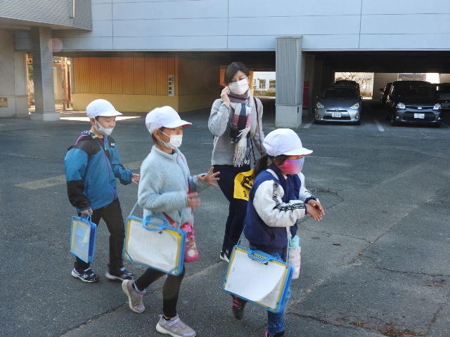 【探検に行ってきます】2年生が2時間目から4時間目まで、生活科の時間に、校区の製麺所、刃物工房、スーパーマーケットなど5つのコースに分かれて、探検に出かけました。それぞれのグループの引率に、地域学校協働活動の学校応援団として保護者の皆様のご協力をいただきました。画像は、応援団の皆様と出発の様子です。