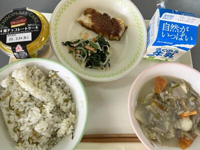 今日はふるさとくまさんデーで、阿蘇地域の郷土料理でした。阿蘇の高菜漬ご飯でした。阿蘇の高菜は、茎が細く、シャキシャキとした食感とピリッとした辛味が特徴です。また、6年生の卒業のお祝いにチョコレートケーキがありました❗️とても美味しくいただきました。給食センターの皆様、1年間美味しい給食をありがとうございました。