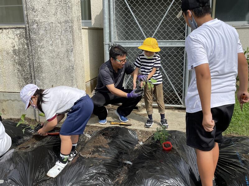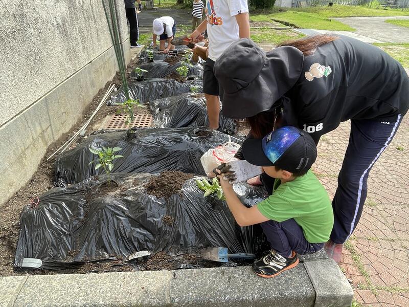 今日はむくのき学級とひばり学級のみんなが野菜の苗植えに汗を流しました。