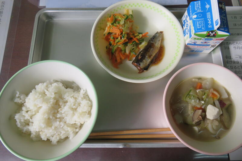 南関町の特産物「節そうめん」を使ったみそ汁、海藻や野菜をつかったサラダ、食物繊維がたっぷり含まれた発酵食品のキムチとビタミンB1が入った豚肉をつかった豚キムチごはん 栄養満点の給食でした。