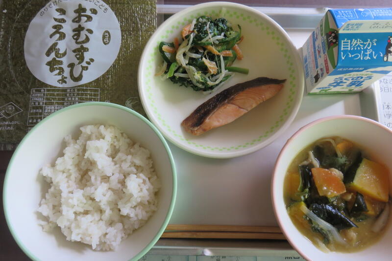 今日の献立は、「セルフおにぎり、栄養みそ汁、サケの塩焼き、ほうれん草の和え物、牛乳」です。
