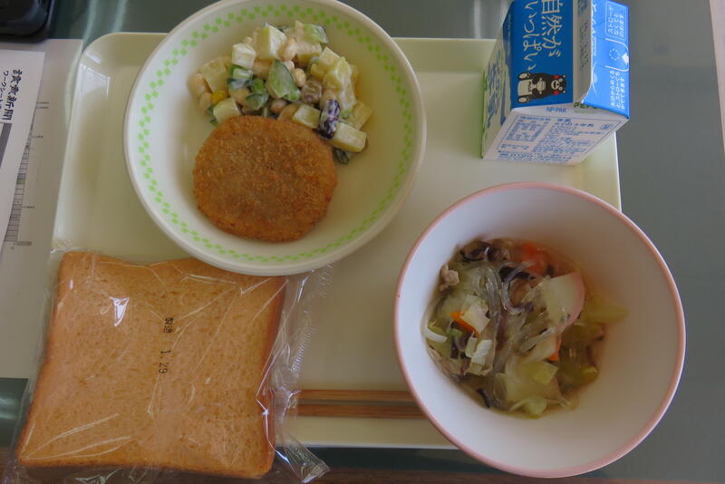 今日の献立は、「トマトパン、タイピーエン、うまかコロッケ、まめまめサラダ、牛乳」です。