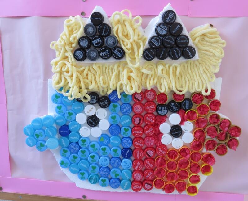 1,2,3年生の様子です。トッパ丸のシュガートーストと一緒に「はいチーズ!!」