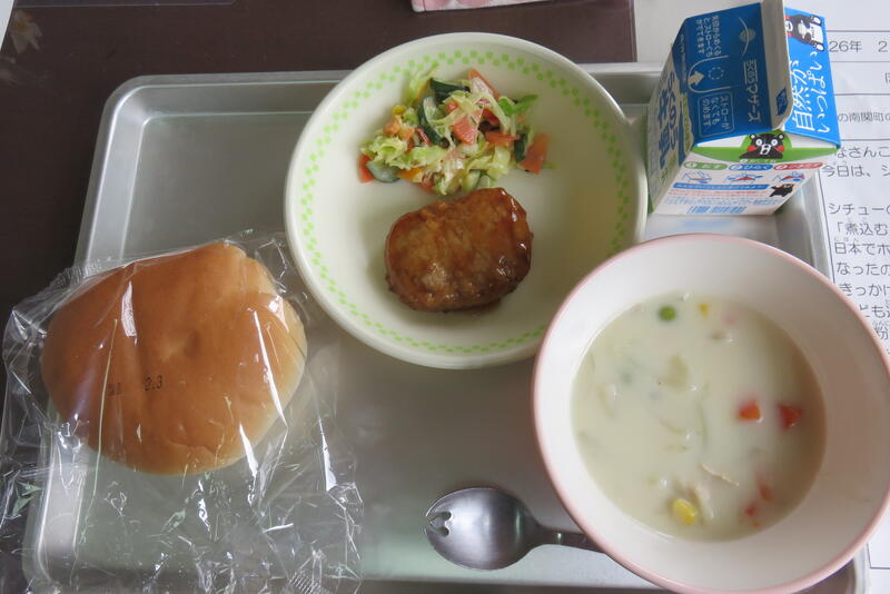 今日の献立は、「シュガーパン、クリームシチュー、カントリーポテト、牛乳」