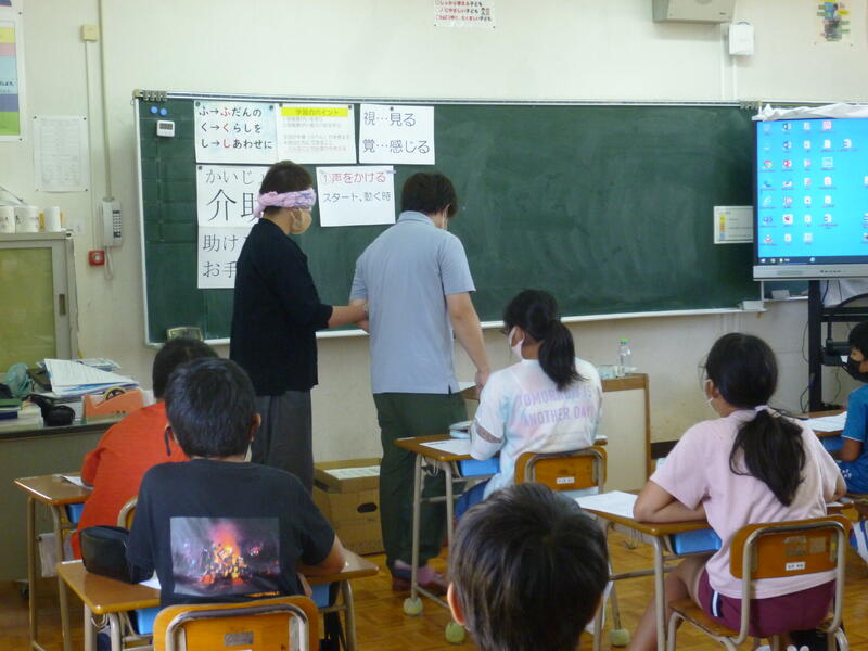 10月6日(水)に、疑似体験を通して高齢者福祉について学習しました。9月29日(水)に引き続き、南関町社会福祉協議会の方々に講師としてご来校いただきました。高齢者疑似体験では、視野が狭くなったゴーグルや重いリストウェイト、アンクルウェイトなどを身に付け、介助される側を体験しました。また、介助する側も体験しました。二週間の体験を通して、誰に対してもやさしく接することのできる思いやりの心がもてたと思います。ご多用中にも関わらず、装具の取り付け等応援してくださったみなさん、本当にありがとうございました。