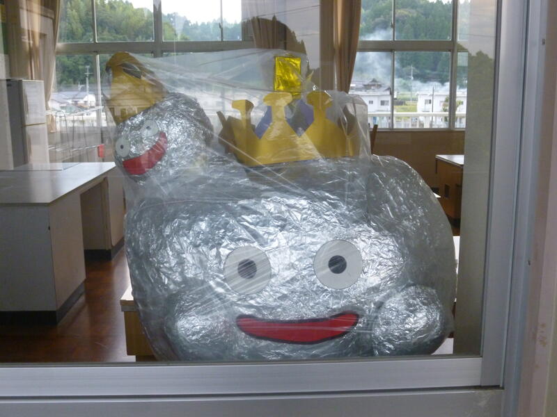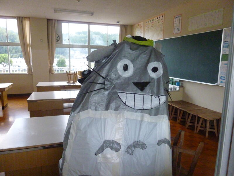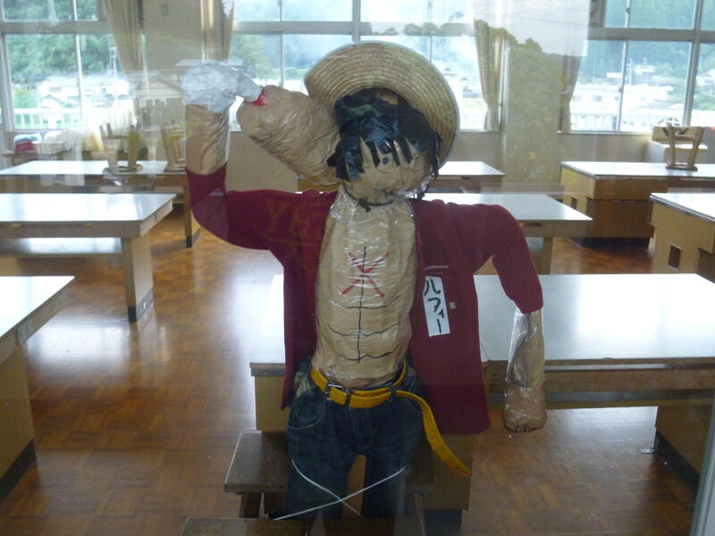 保護者の方々にご協力いただき、立派なかかしを授業時間内につくりあげることができました。つくったかかしは、ルフィ、メタルスライム、ミライトワ、トトロでした。子どもたちの思いが形になったかかしだと思います。保護者の方々と子どもたちが一緒になって、一つの作品をつくり上げることはとても素晴らしいことだなぁと思いました。かかしは、しばらく校内に展示し、その後田んぼに設置したいと思います。