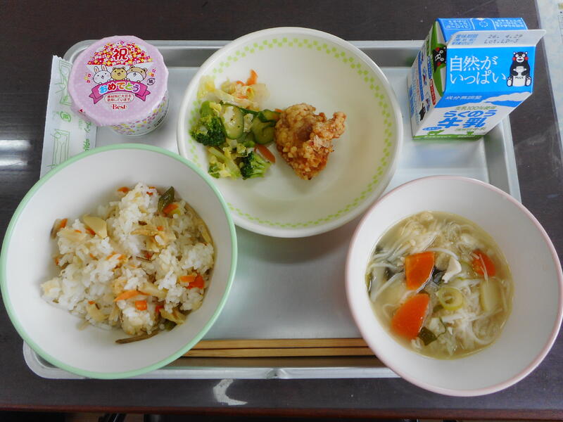 今日は、お祝い献立です。牛乳、タケノコご飯、節そうめん汁、鶏肉の唐揚げ、グリーンサラダ、いちごゼリーです。地元の食材もたくさん使われています。おいしくいただいて、ふるさと南関町が大好きな子どもたちに育ってほしいです。