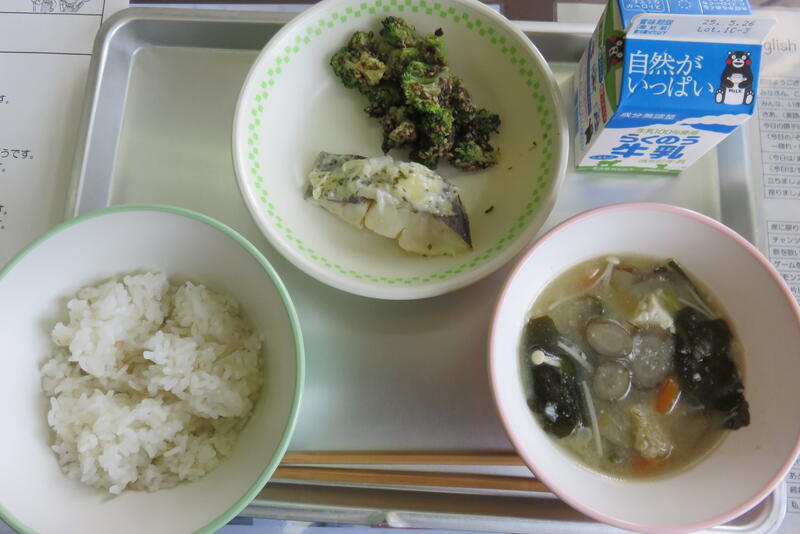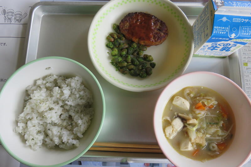 今日の献立は、「麦ごはん、呉汁、鶏肉の香り焼き、じゃこサラダ、牛乳」です。おいしくいただきました。