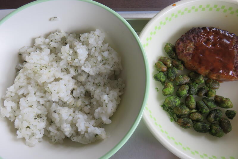 今日の献立は、「びりんめし、白玉だんご汁、ししゃもフライ、ごぼうとれんこんのサラダ、牛乳」です。