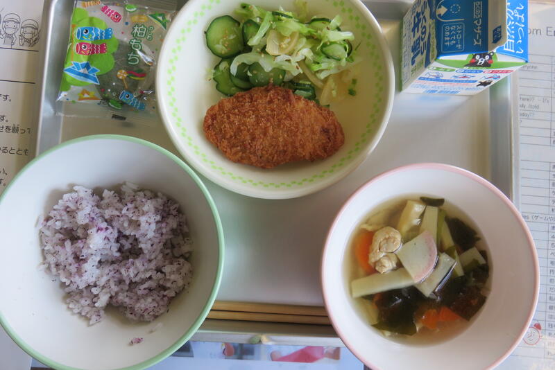 今日の献立は、「麦ごはん、節そうめん汁、かぼちゃとひき肉のフライ、ゆず和え、牛乳」