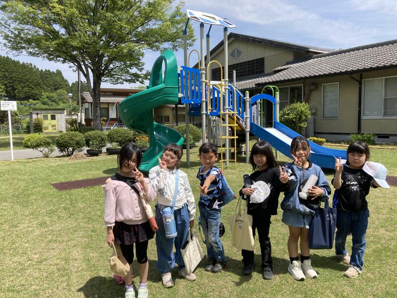 1,2,3年生の様子です。トッパ丸のシュガートーストと一緒に「はいチーズ!!」