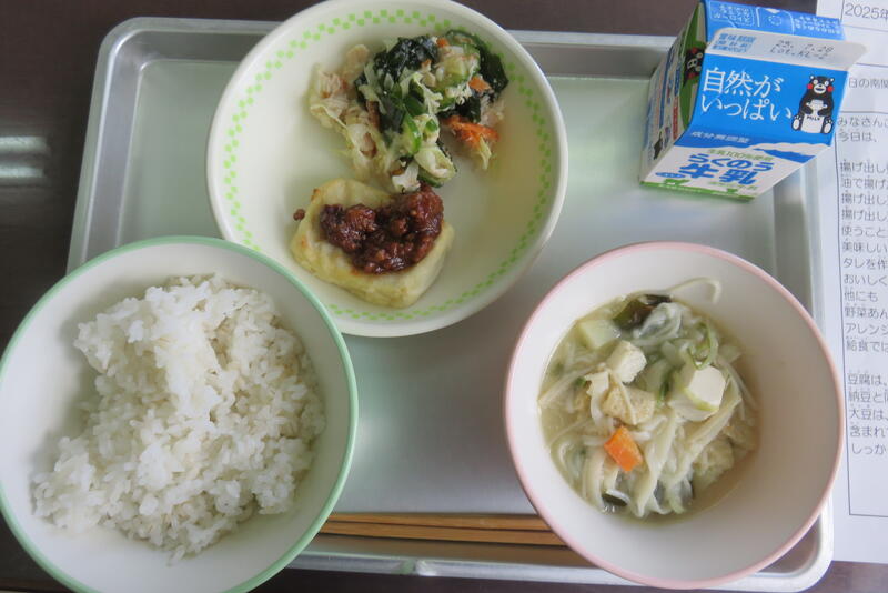 今日も南関町の食材がたくさんあります。「南関米、里芋、キャベツ、ねぎ、節そうめん、南関あげ」節そうめん汁は、ほとんどが南関町の食材で作られていました。
