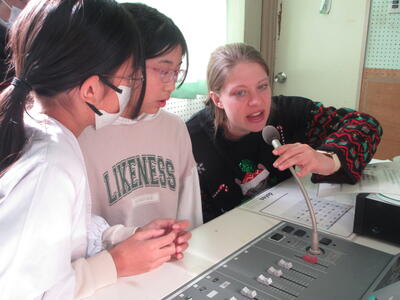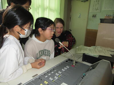 お昼の放送でコリーン先生と英語会話を放送しました。