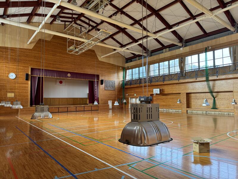 体育館の電灯を入れ替えています