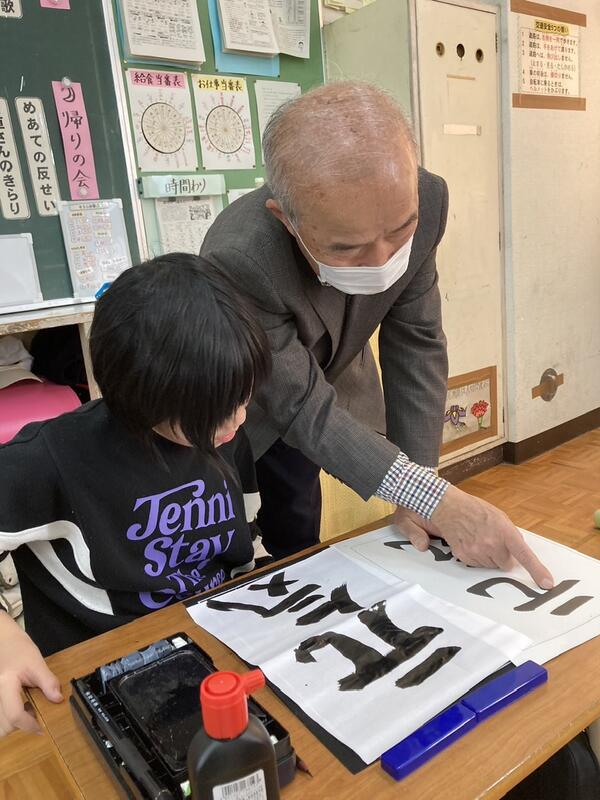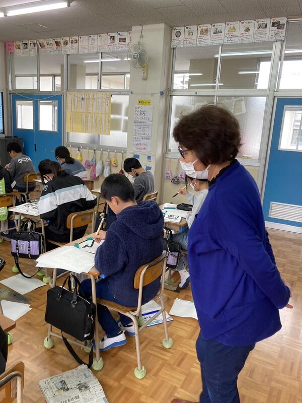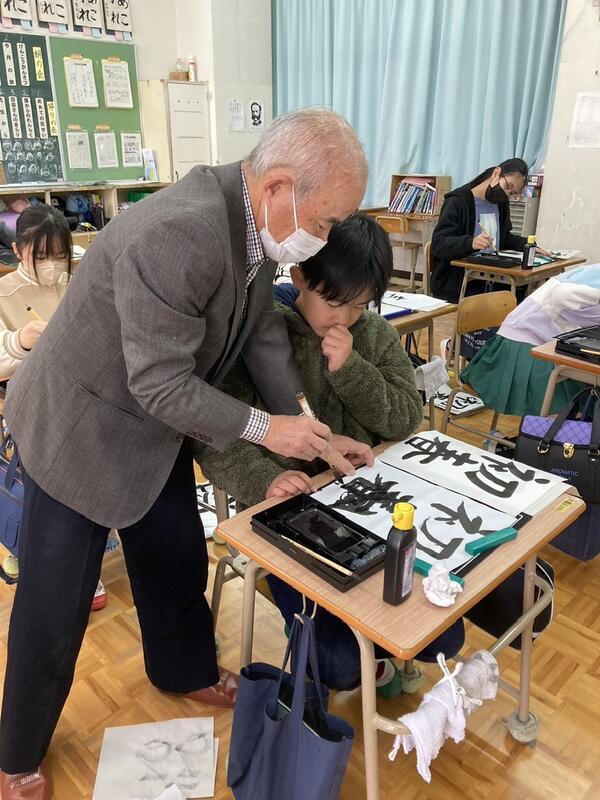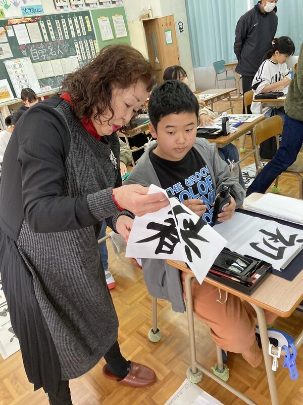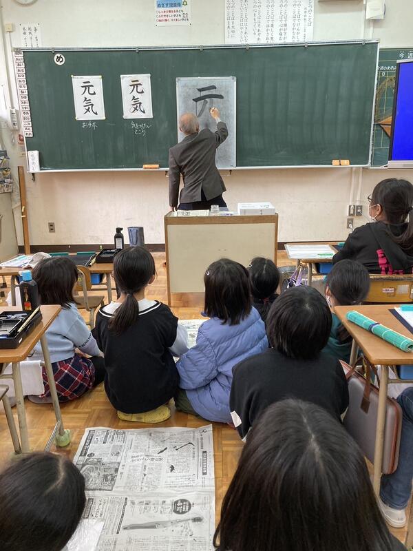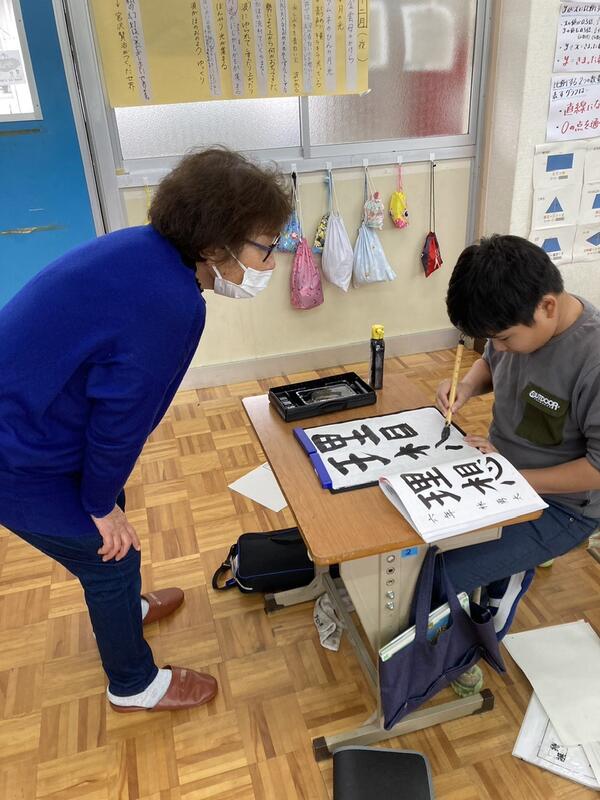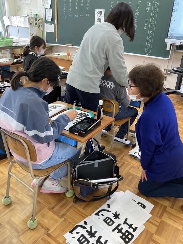 12日6年生は書写の時間に、葛城先生に来ていただき習字を習いました。いつもありがとうございます。