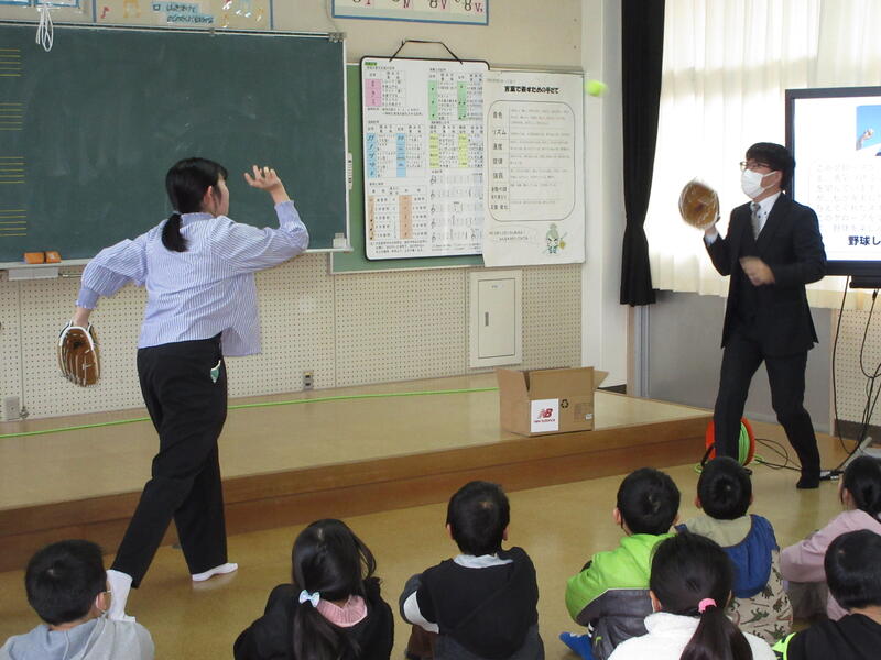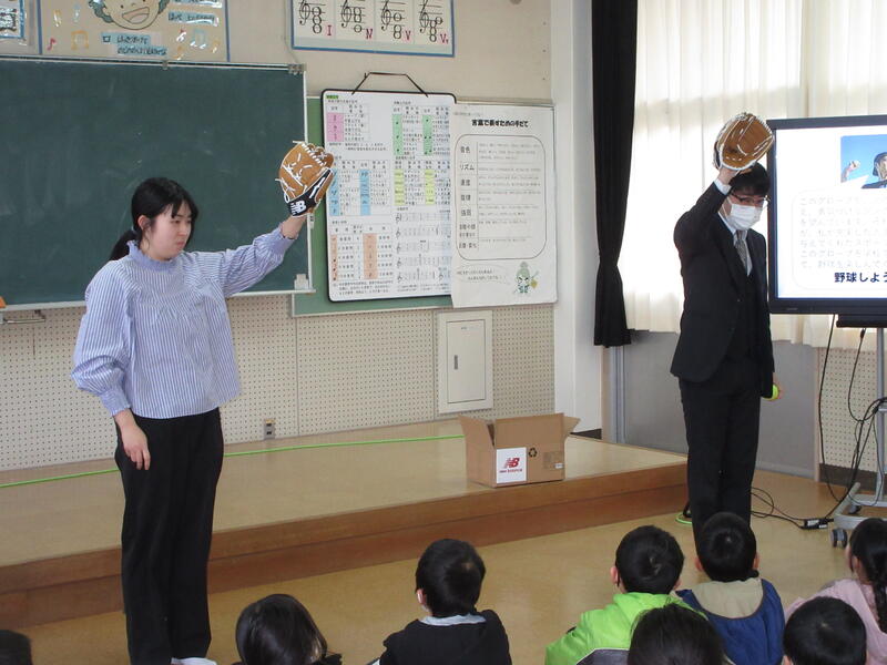 校長先生からの大谷翔平選手からのメッセージなど紹介の後に、冨田先生と永田先生でグローブの披露をしました。