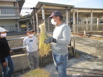 11月9日、5年生は西田さんにお世話になり、稲刈りをしました。学校に戻り稲を干しました。