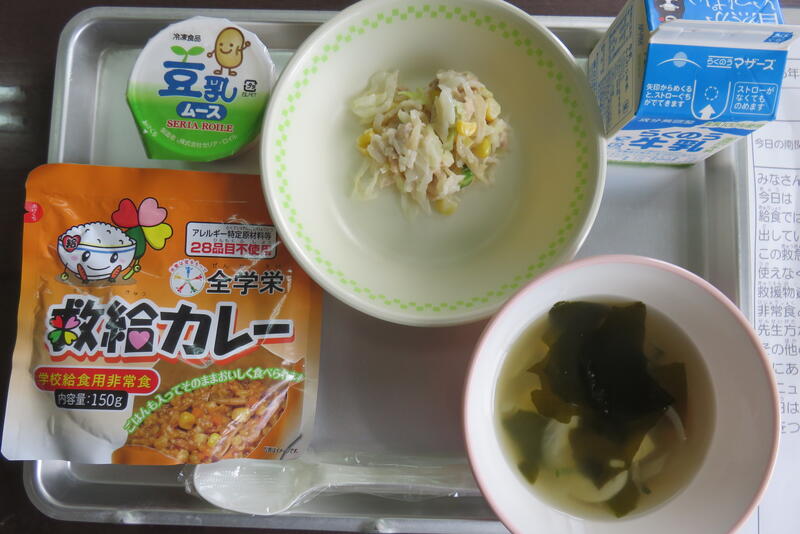 今日の給食の献立は、「救急カレー、わかめスープ、ストックサラダ、豆乳ムース、牛乳」救急カレーの中を開けるとこんな風です。しっかり味もついています