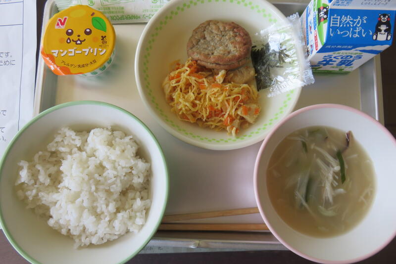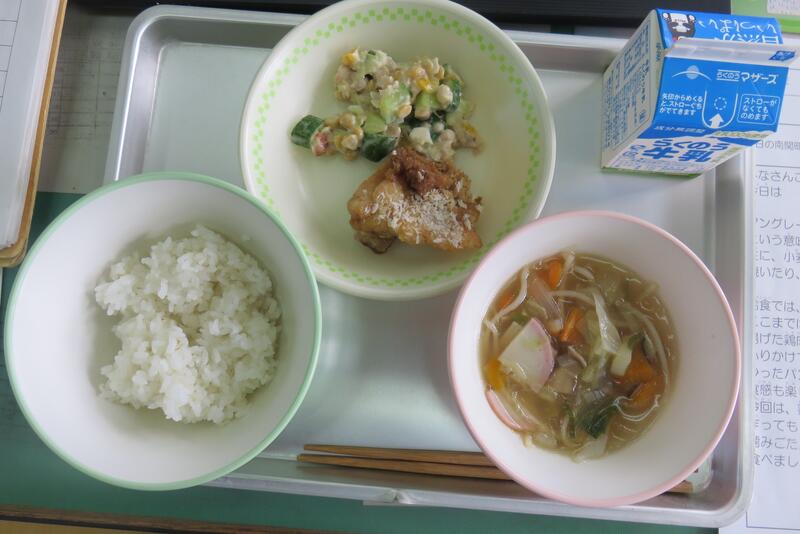 給食は「麦ごはん、チンゲンサイのスープ、ささみのレモン漬け、ちぐさあえ、牛乳」