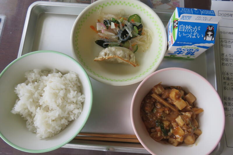 今日の献立は、「麦ごはん、マーボー豆腐、ぎょうざ、はるさめの酢の物、牛乳」です。