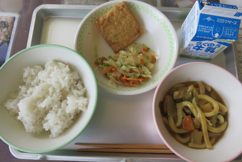 今日の給食の献立は、「麦ごはん、カレーうどん汁、信田煮、ごま和え、牛乳」です。