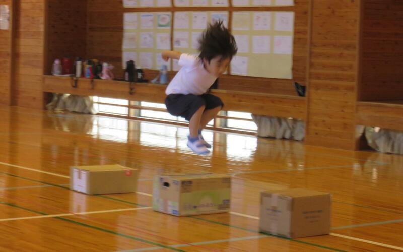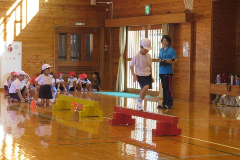 【12年】うんどうあそびや体づくりうんどうです。平均台やジャンプ、ジグザグ走など、楽しくかつ一生懸命にがんばっています。
