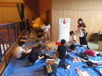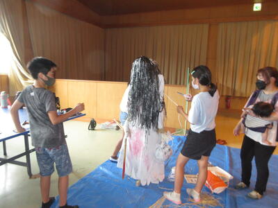 8月21日(日)の親子美化作業が終わった後に、かかしづくりを5学年PTA活動として行いました。保護者と子どもが力を合わせて、保護者が一生懸命に制作に取り組んでおられました。3グループで制作に取り組んでいますが、完成したら、南関町のかかしコンクールに出品をします。完成が楽しみです。