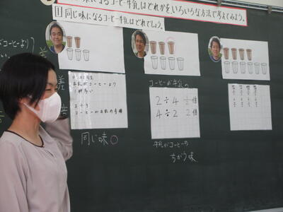 濃さの異なる3種類のコーヒー牛乳の絵を提示し、コーヒーと牛乳の割合について「比」を使って考える授業でした。子どもたちがよく知っている先生方のコーヒー牛乳について考えることで、学びの動機付けが高まったようでした。