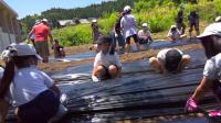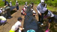 暑い中、草むしりをした後にマルチをかけ、芋の苗を植え、水やりをしました!