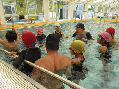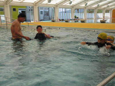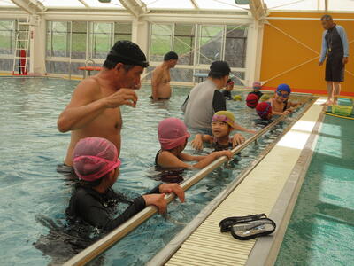 南関第二小学校は町教育委員会やA-life南関からの支援を受け、B&Gプールの多大なご厚意で、B&Gプールで今年から水泳授業をすることができています。利点はやはり、プール環境の素晴らしさと、なんと言ってもA-life南関からの支援による専門性あふれる細やかな指導・支援です。子供たちは水になれ、水泳能力を伸ばすためがんばっています。