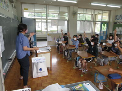 7日(火)にカルビーから訪問授業で来校いただき、朝の朝食など食育に関することについて話をしていただきました。朝からじっくり時間があるときの朝食と、朝から時間がないときの朝食をワークシートボードを使いながら考え、自分が作ったマイ breakfastの栄養をどうだった考えました。また、食物繊維を多く含む食品はどれだなどを当てるクイズでは、予想を裏切る回答で盛り上がっていました。授業後には、お土産も頂きました。