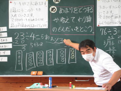 22日(水)、ふれあい学級で樫原先生が算数科研究授業を行いました。あまりのある割り算について考えを深め、計算力を高めることができました。