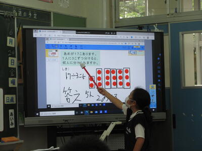 「わり算を考えよう」の単元で、あまりのあるわり算について考え、その計算の仕方を交流していきました。図を使ったり、言葉を使ったりして、割り切れない場合はどうするのか協働的な学習を通して理解を深めていきました。