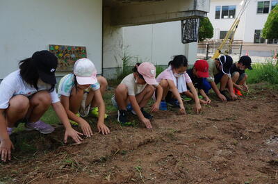 6月27日(月)、3年生は丸美屋の福永さんにきていただき、大豆の種まきをしました。これから生長していくのが楽しみです。たくさんのおいしい大豆の収穫をしたいと思います。