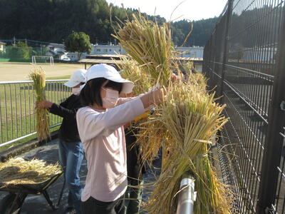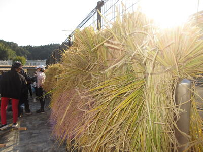 11月9日、5年生は西田さんにお世話になり、稲刈りをしました。学校に戻り稲を干しました。