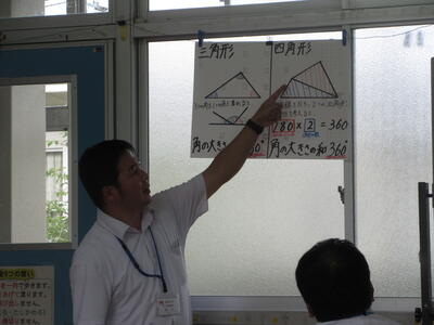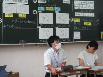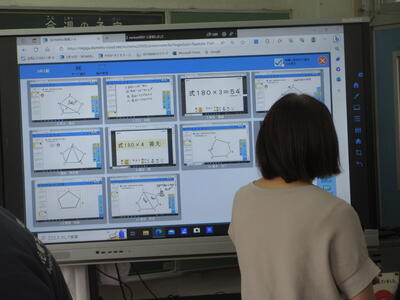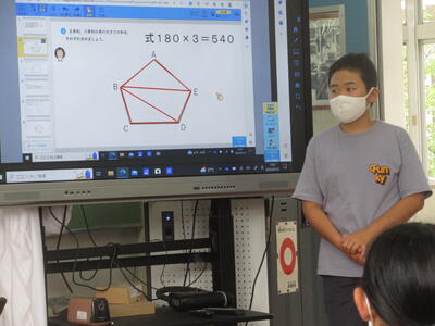 角の大きさの和を求める学習をしており、本時は5角形や6角形の内角の和を求める学習でした。