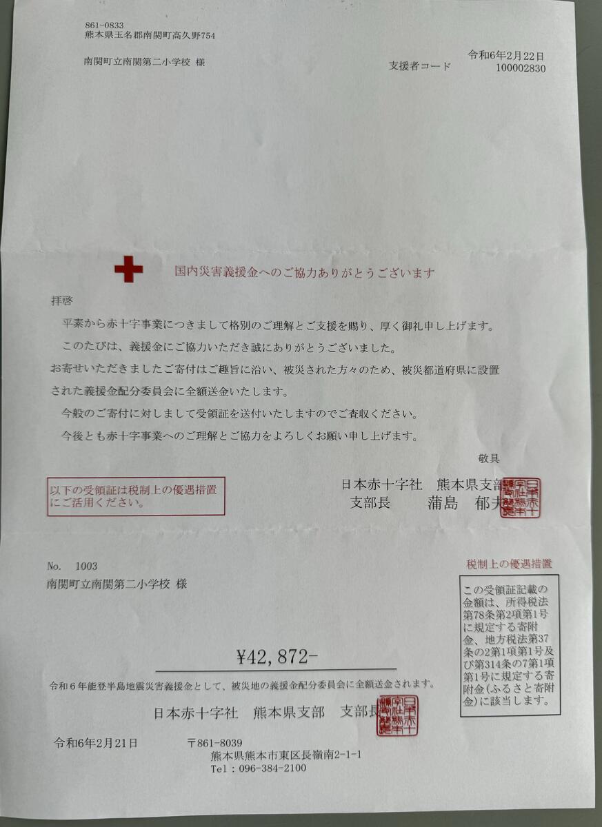計画委員会を中心に募ったR6能登半島地震義援金を南関町社会福祉協議会を通じて日本赤十字社にお渡ししました。