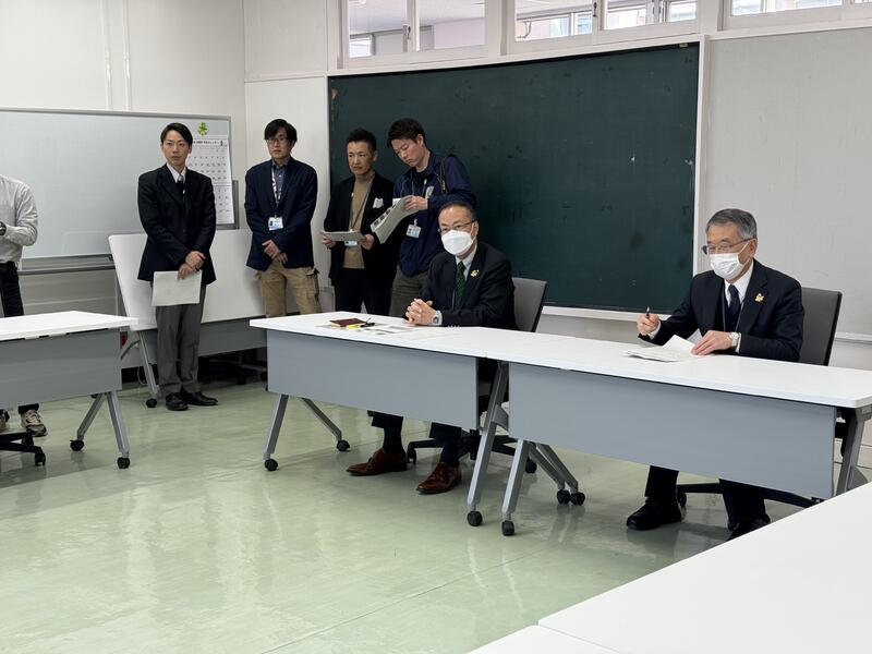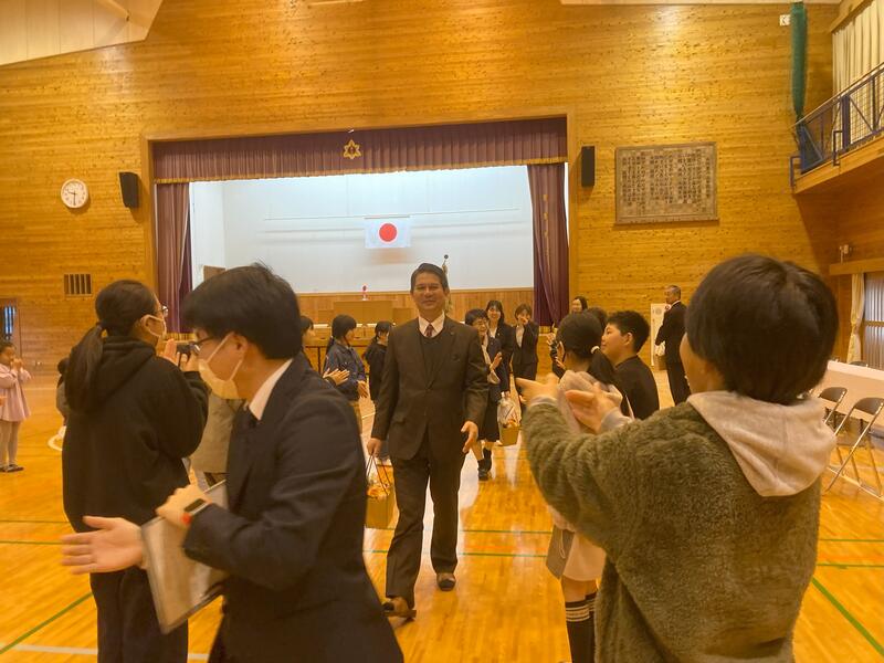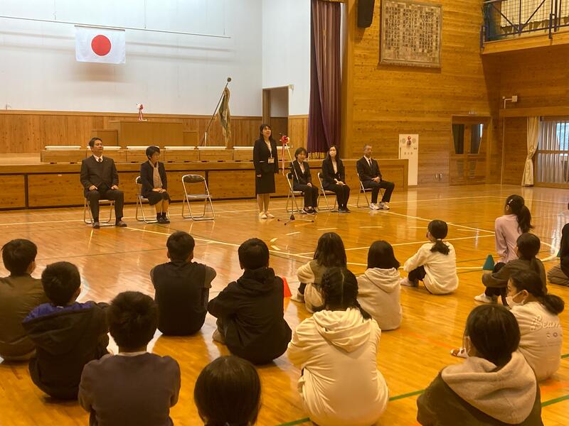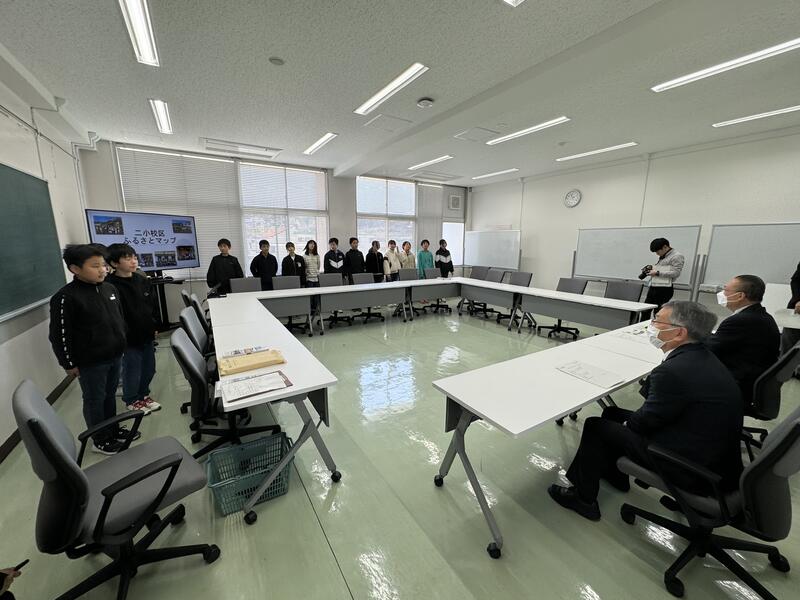 南関第二小学校では、3~6年生の「総合的な学習の時間」や1~2年生の「生活科」の授業で学習してきたことを、リーフレットにまとめました。各家庭に持ち帰ってきたと思います。もうご覧になったでしょうか。お世話になった方々や地域、グローバルに発信するなどしていきます。そのひとつとして、3月13日には、6年生が南関第二小学校を代表して南関町役場を訪問し、リーフレットを贈呈する場を設けていただきました。南関二小ふるさとマップについて、説明をした後に、南関町佐藤安彦町長と谷口慶志郎教育長から、温かいお言葉を頂きました。