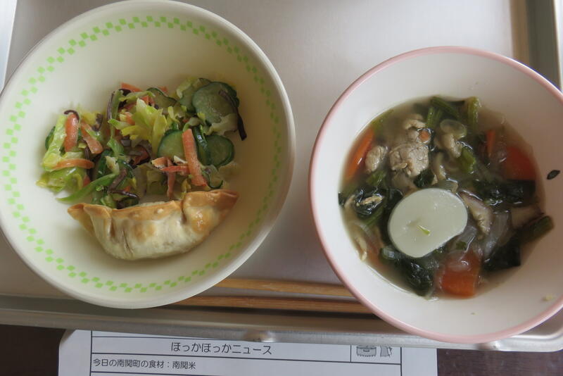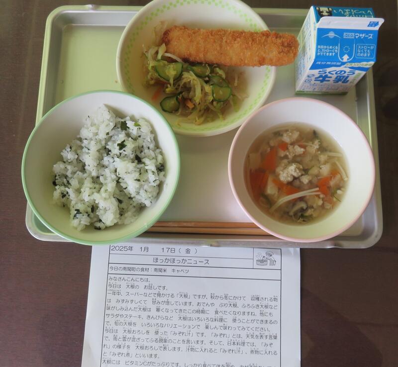 今日の献立は「麦ごはんを使ったセルフおにぎり、すいとん、メバルの塩こうじ焼き、はりはり漬け和え、牛乳」です。