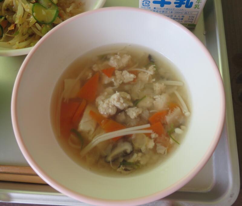 今日の給食では、「五色ごはん」には、里芋、大豆、にんじん、枝豆が入っています。「栄養みそ汁」には、かぼちゃ、しいたけ、玉ねぎ、豆腐、にんじん、しめじ、わかめ、ねぎ、南関あげが入っています。本当にこの2つ食べれば、栄養満点と思いました。ごちそうさまでした。