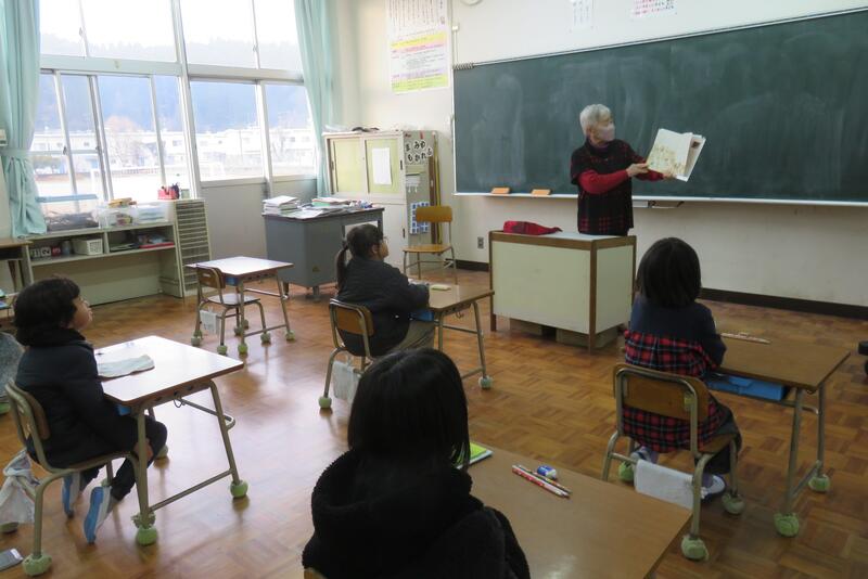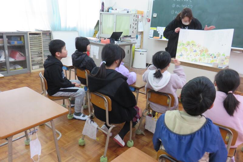 1月20日(月曜日)読み聞かせに来ていただきました。からたちの会から3名、保護者の方が2名の計5名です。
